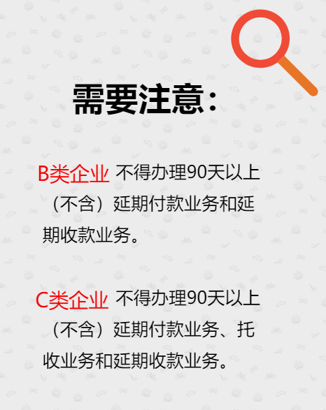 (四)B、C类企业在分类监管有效期内发生的预收货款、预付货款,以及30天以上(不含)的延期收款、延期付款;