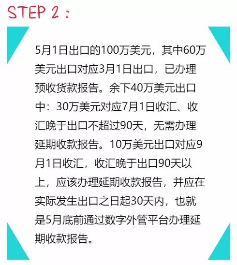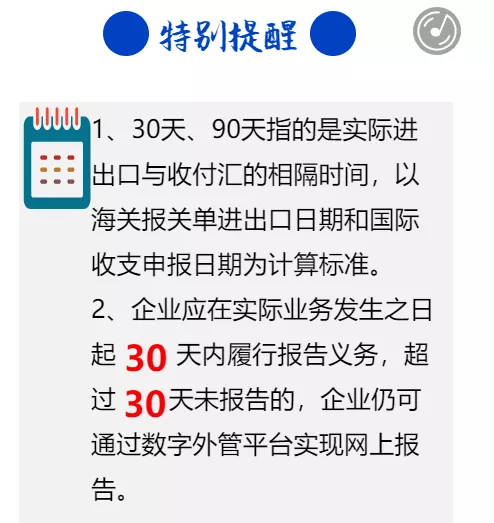 比如以下情况,企业的报关时间和收/付款时间超过30天(预收/预付)或者90天(延收/延付)的,企业就需要向外汇局系统报告。