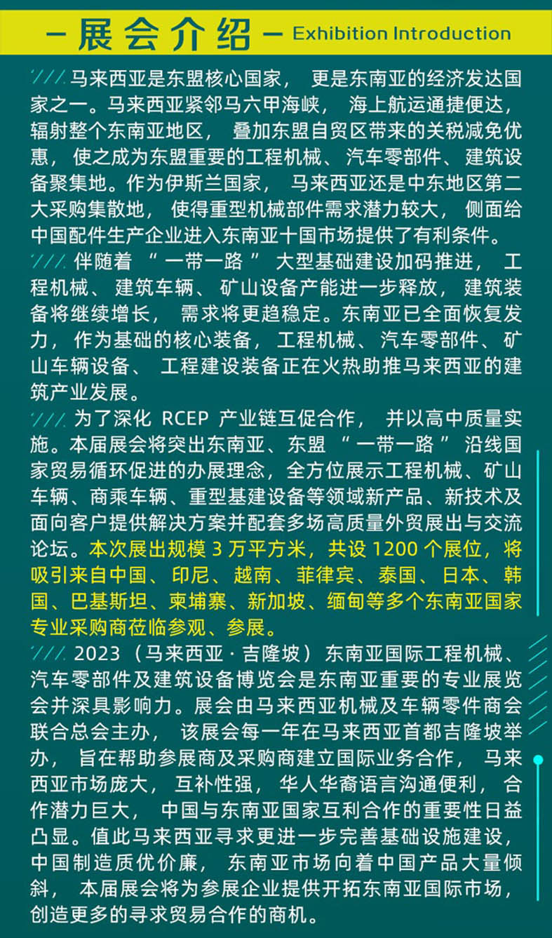 2023(马来西亚·吉隆坡)东南亚国际工程机械、建筑设备及汽车零部件博览会是东南亚重要的专业展览会并深具影响力。展会由马来西亚机械及车辆零件商会联合总会主办,该展会每一年在马来西亚首都吉隆坡举办,旨在帮助参展商及采购商建立国际业务合作,马来西亚市场庞大,互补性强,华人华裔语言沟通便利,合作潜力巨大,中国与东南亚国家互利合作的重要性日益凸显。值此马来西亚寻求更进一步完善基础设施建设,中国制造质优价廉,东南亚市场向着中国产品大量倾斜,本届展会将为参展企业提供开拓东南亚国际市场,创造更多的寻求贸易合作的商机。